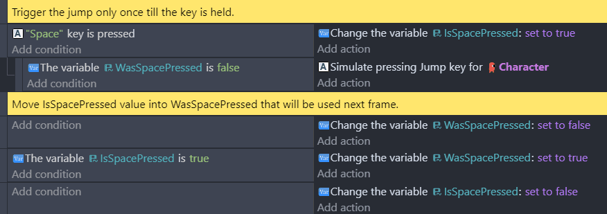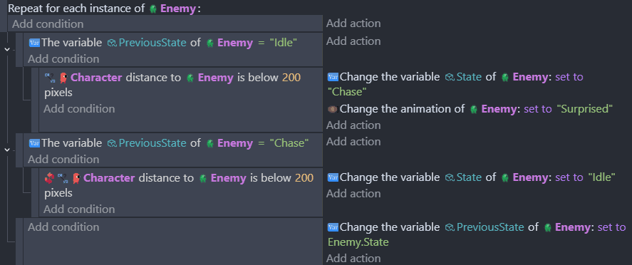 For example, if you want to play a "surprised" animation when the player gets close to an enemy, the "trigger once" condition may work if enemies are spaced far apart. However, if the player is already being chased by one enemy, other nearby enemies will not trigger the "surprised" animation.