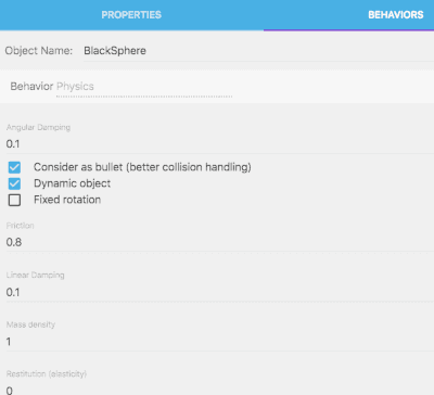 Additionally, objects with the Physics behavior ignore the object's Collision Masks and instead use the collision information on the BEHAVIORS tab of the object itself. This defaults to a box that is the full dimension of the object. In most cases, there will be a need to change these settings from within the BEHAVIORS tab.