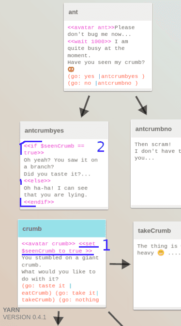 Apart of the commands you can set up for yourself, and the ones built into the extension, yarn's parser library - bondagejs comes with a few very cool built in ones that can be used to store information and use it to conditionally show text to the user. So lets say your player visits a dialogue branch of an item once and has read it. Then having that information, the player starts a conversation with a npc.