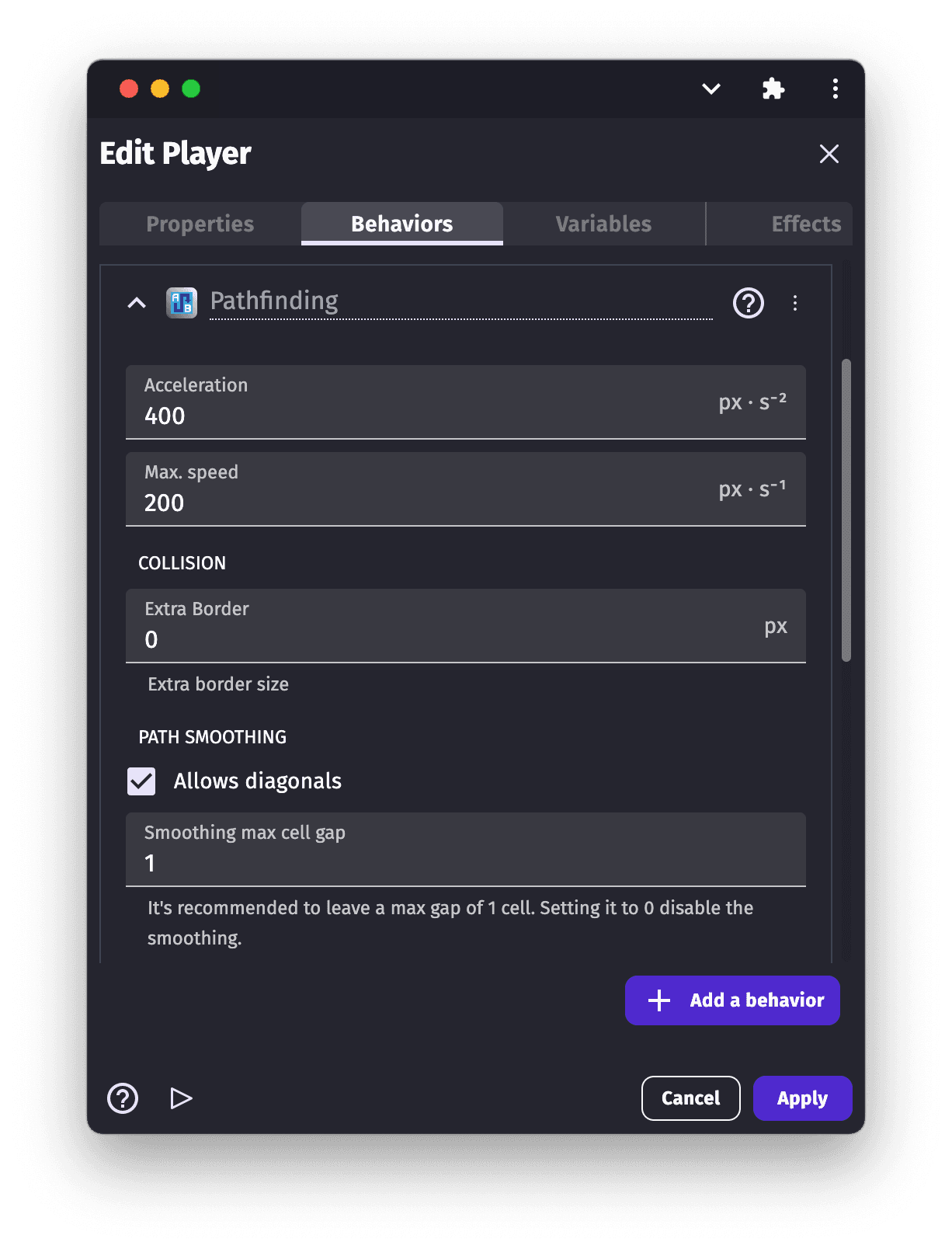 To initiate a pathfinding move, add the action "Move to a position" and specify the location you want the object to move to. It will move using the characteristics defined in the behavior properties. If you want to change how the object moves during the game, these properties can be changed using actions.