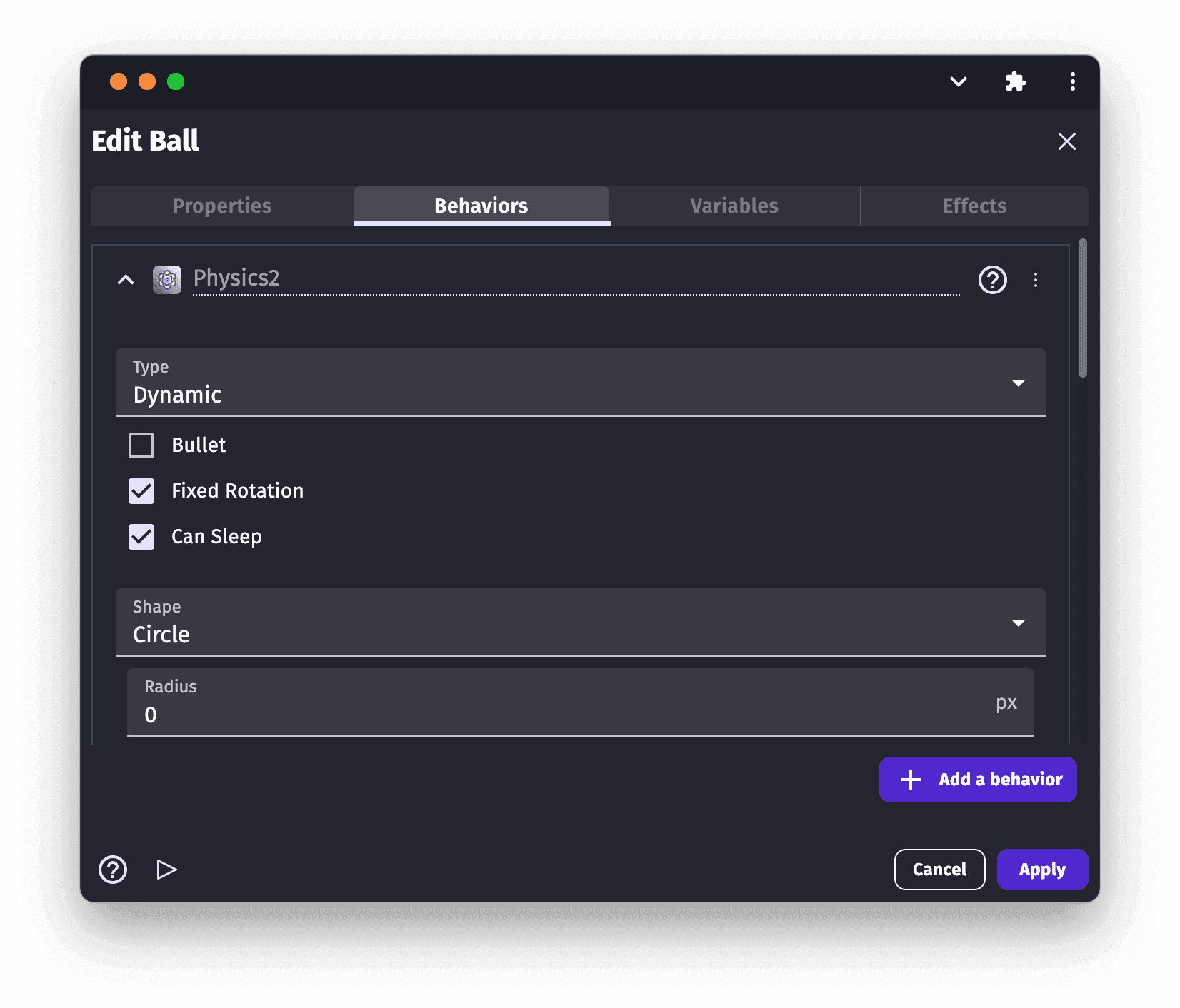 When you add the Physics behavior to an object, you can set the body configuration right from the IDE. There are many options to play with. They have been categorized below. .