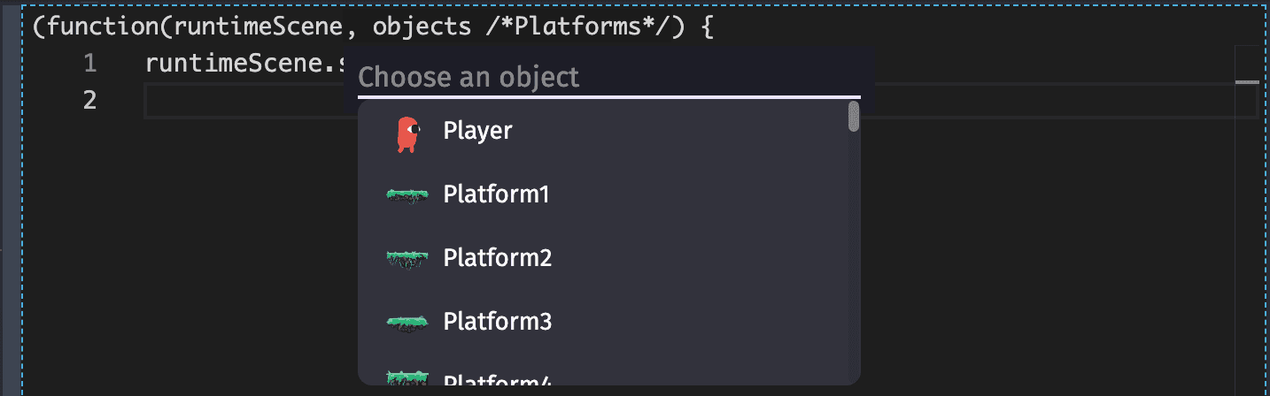 Most of the time annotations are not needed. The methods that you are using are already setup with type annotations. But when you use a list of objects, you may want to access this object specific method (for example, methods to modify the animation of a sprite object). In this case, you could write /** @type {gdjs.SpriteRuntimeObject} */