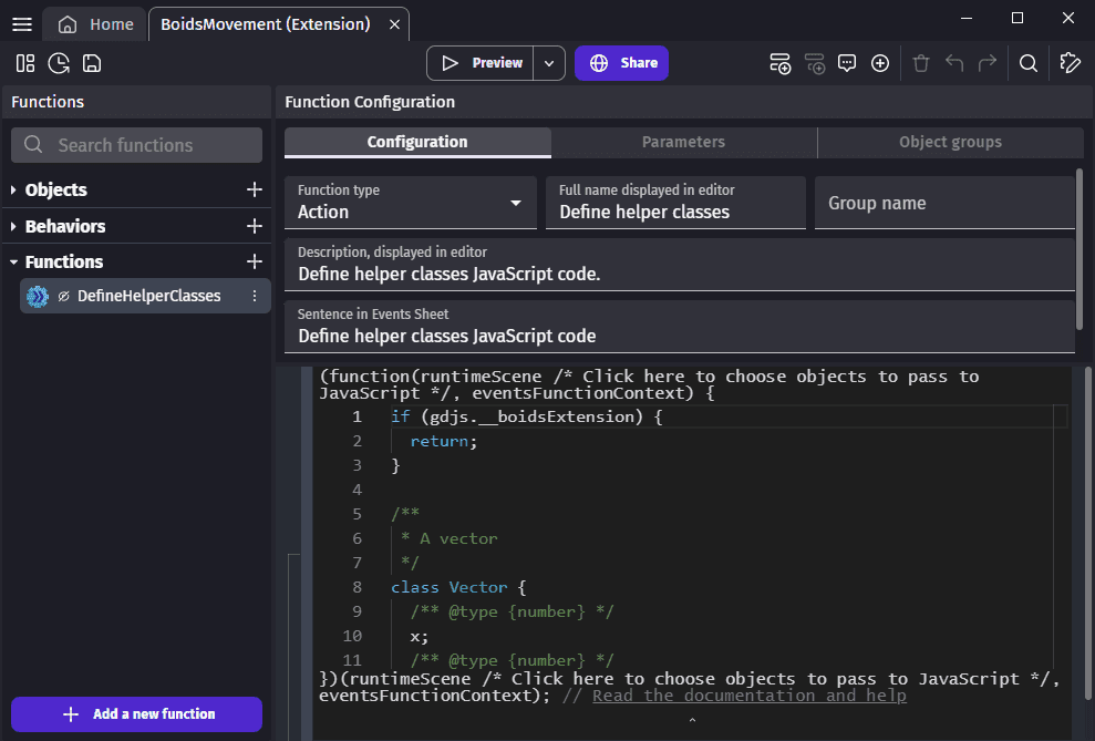 Remember to make sure your extension is used by the game so that the file is included. If you export your extension, this file won't be included. Consider this option as an experimental option to add custom JavaScript code to a project.