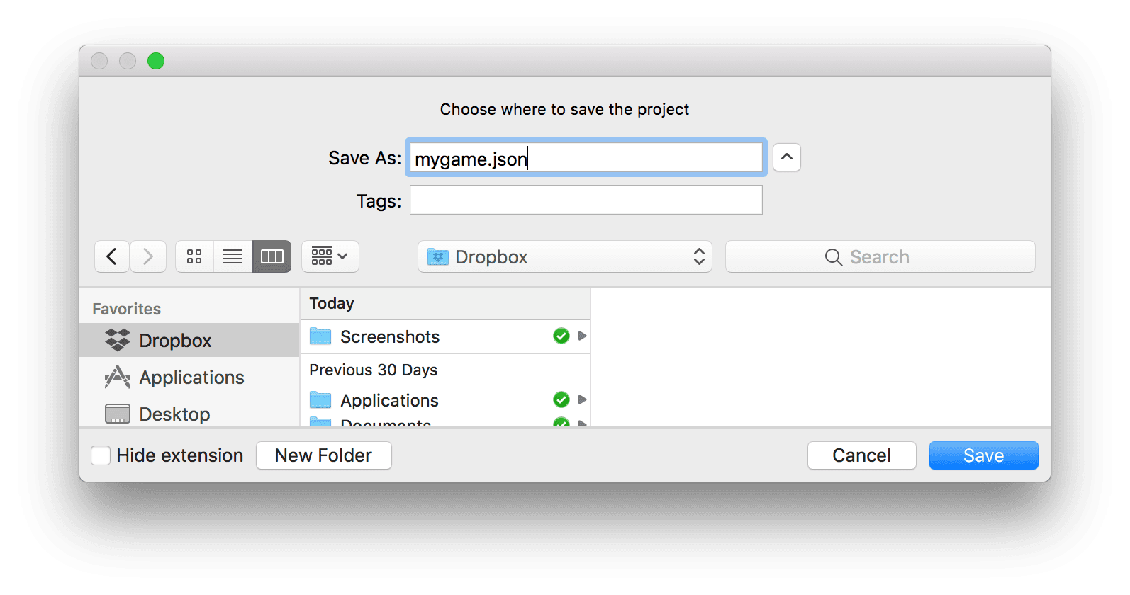 • Choose a folder, then enter a filename finishing by .json. For example: