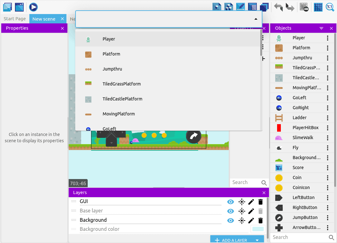 GDevelop provides keyboard shortcuts that allow you to quickly navigate to different areas. You can customize them to fit your preferences.