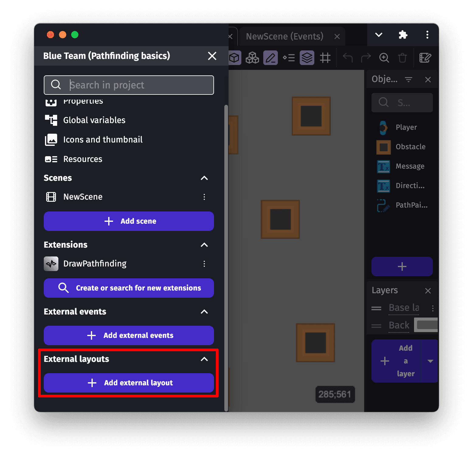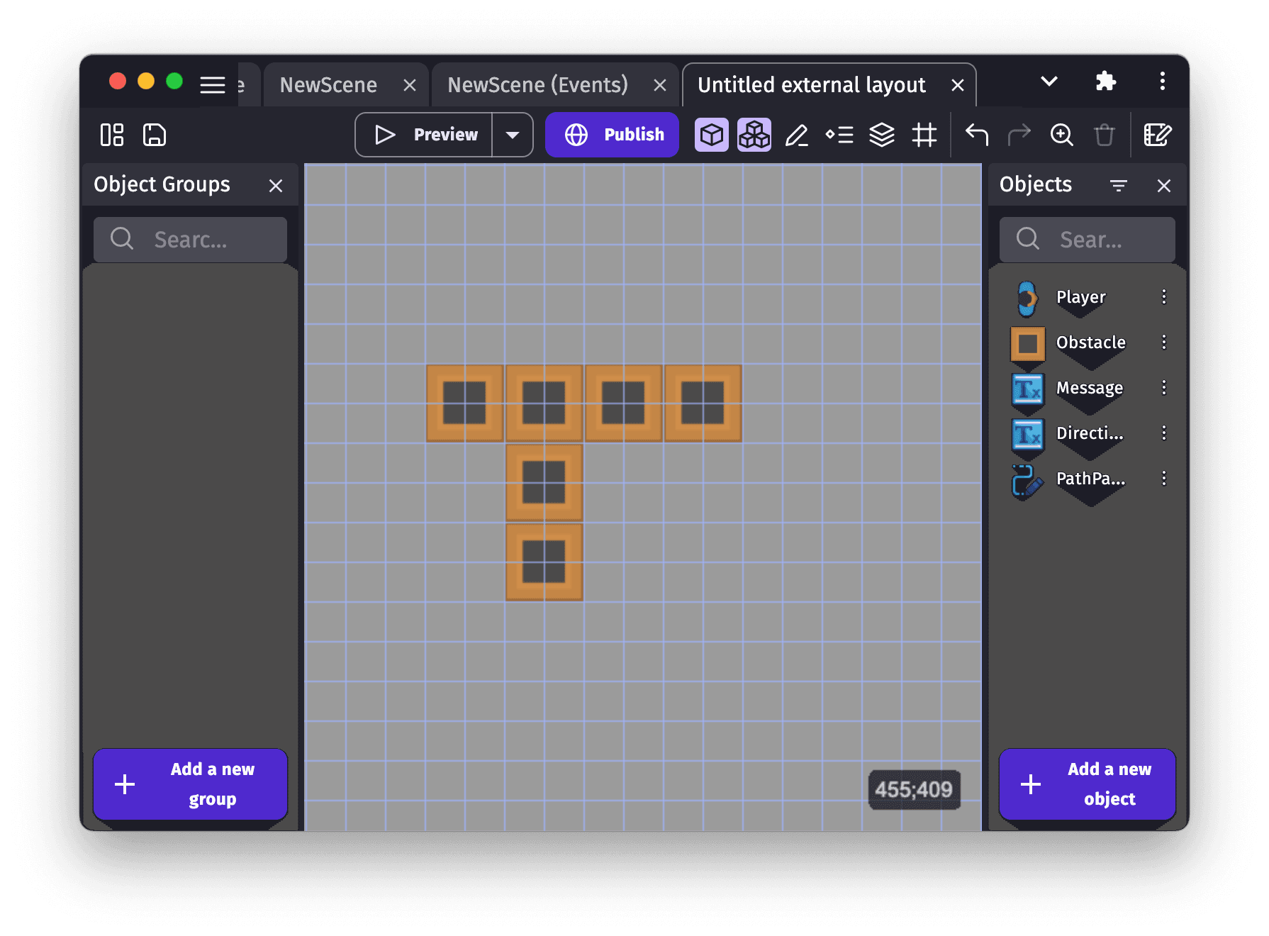 An external layout can be used to create a layout of objects, in the same way you would in a scene editor. Objects in an external layout can then be dynamically loaded into a scene using the action Create objects from an external layout.