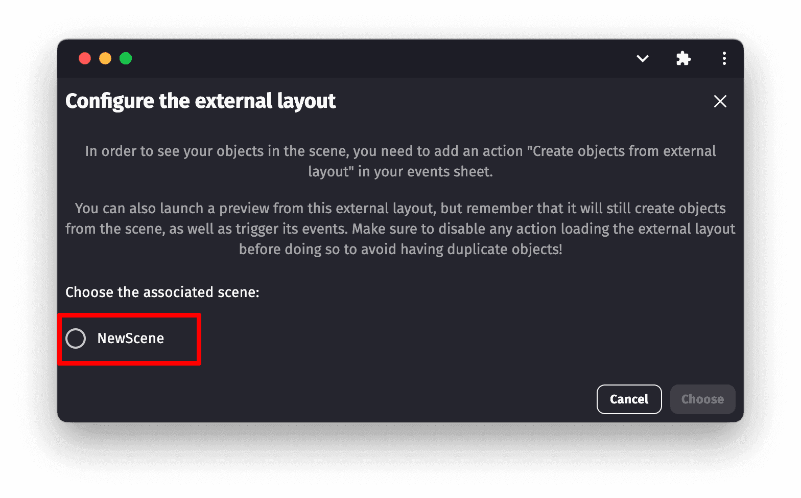 If you use this action, make sure to run it with either the At the beginning of the scene or Trigger once condition. Otherwise, new objects from this external layout will be created every frame, which will drastically reduce performance and create too many objects.