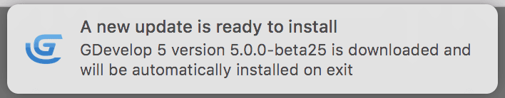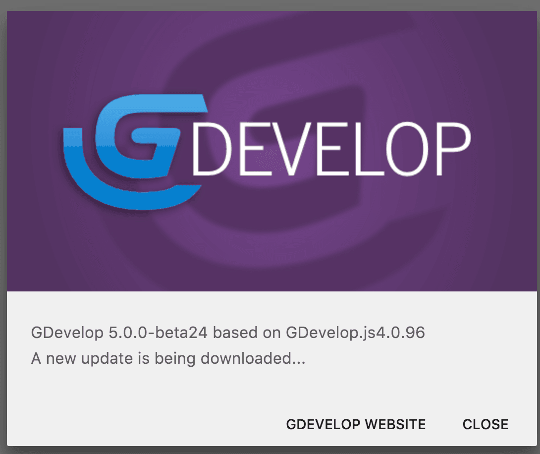 You can now close GDevelop and open it again: the new update will be installed. Check again the About window to see the version number updated.