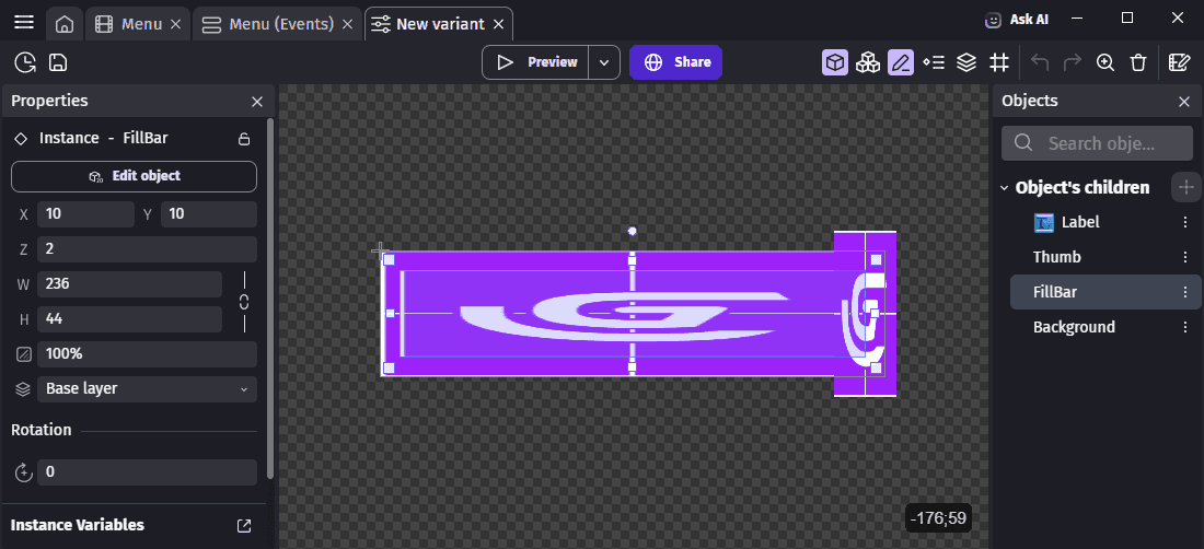 - Report your configuration on the Object's children on the left. For convenience, you may want to open your project backup in a second instance of GDevelop.