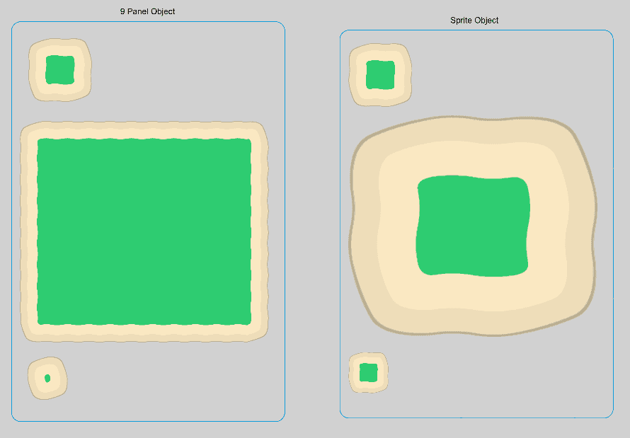 While the normal sprite object's image is scaled uniformly, the 9 patch sprite object's image is scaled as different segments, maintaining their proportion and the image's quality.