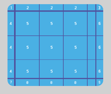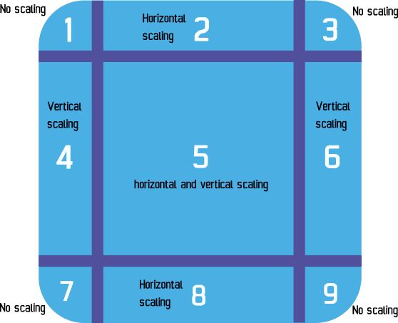 The texture is split into 9 segments, 1 to 9. Each of those segments will be scaled separately. Segments 1, 3, 7, and 9 keep their size and are not scaled, while segments 2 and 8 get scaled only horizontally, 4 and 6 get scaled only vertically, and segment 5 gets scaled both horizontally and vertically. Segments 2, 4, 5, 6, and 8 may repeat instead of scaling based on the panel sprite's object properties settings.