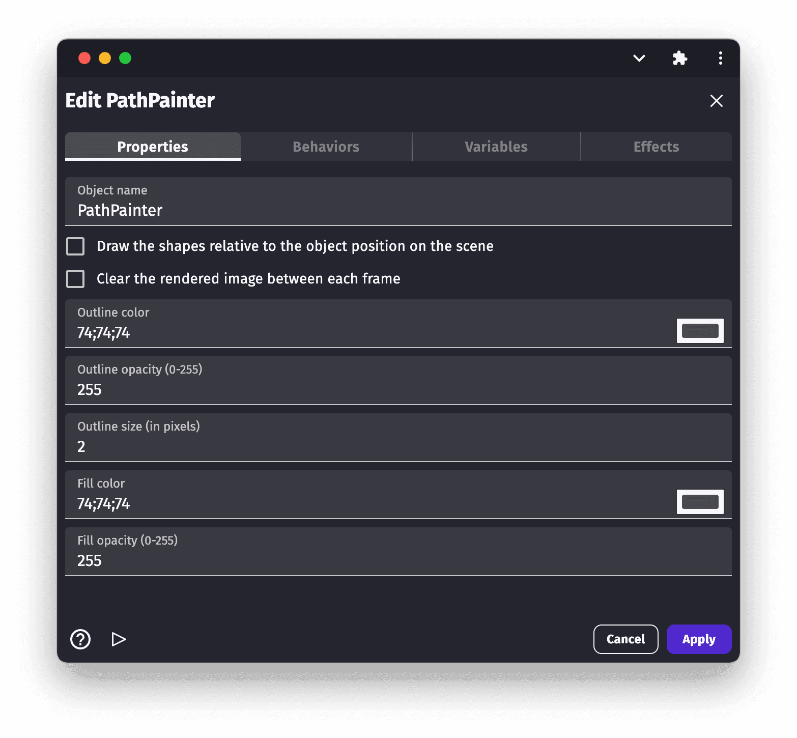 The Shape Painter object properties allow us to change the outline colour/color of the object, the fill colour/color of the object, the opacity of each colour/color, and the outline size of our object.