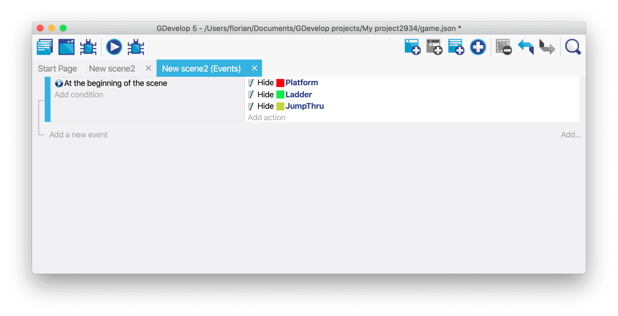 A platformer game often needs different kind of objects like platforms, jumpthru or ladders. One collision mask should be created for each kind. The example in the following screenshots can be opened in the online editor (open the project).