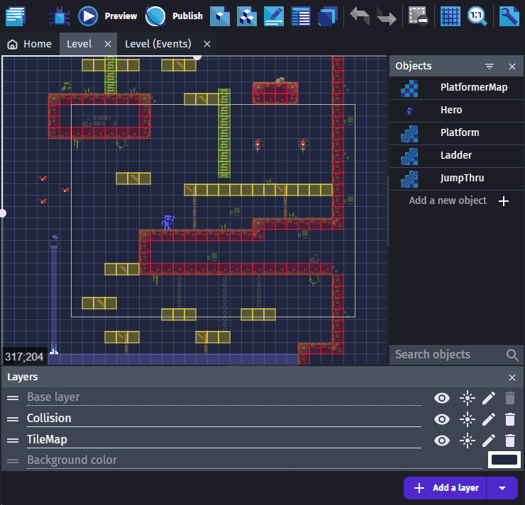 - Only collisions from Tiled are supported - for LDtk you will need to manually create them as separate invisible objects in GDevelop.