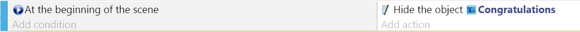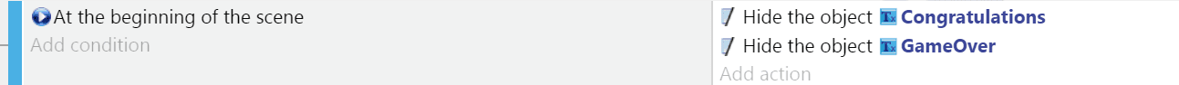 Follow the same steps to hide the GameOver object as you did for the Congratulations object. Add it as a second action to the event.