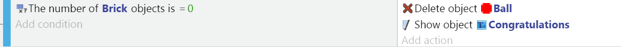 If there are 0 bricks, the ball should be deleted and the congratulations object should be made visible. Both of the actions are common actions for all objects. Add them now.