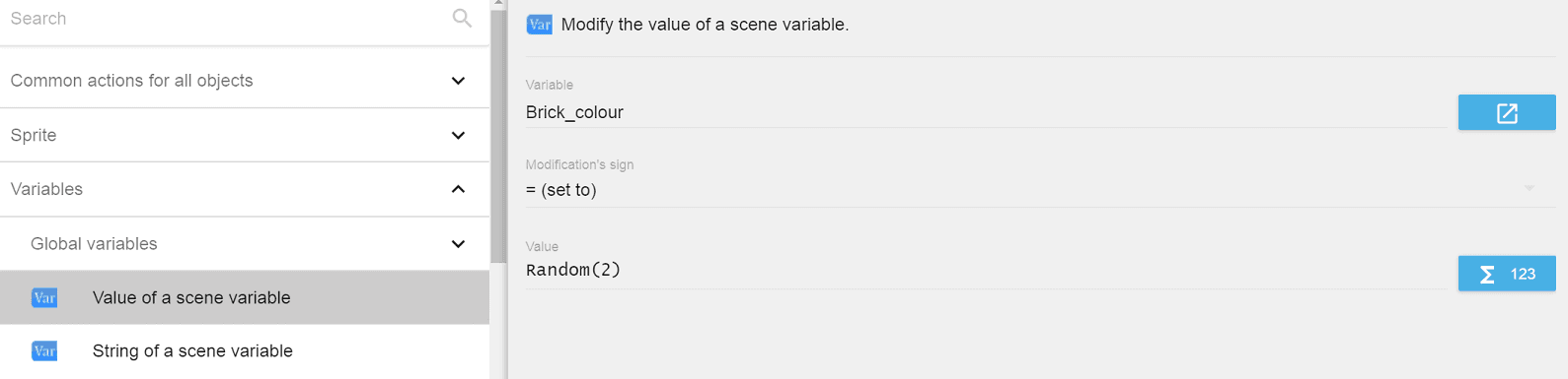 • Click Variables > Value of a scene variable.