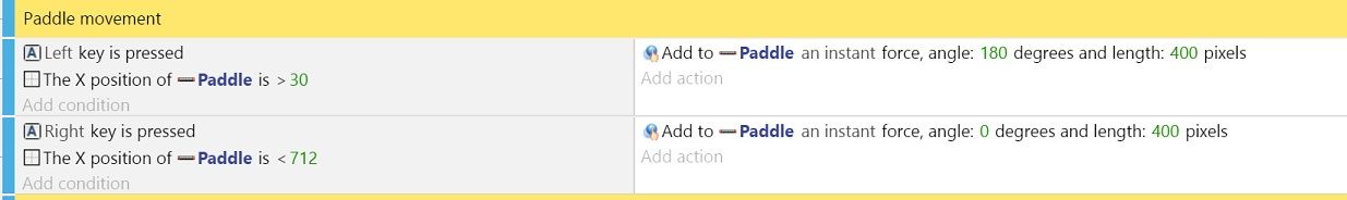 Do you find your paddle is still passing the barrier on the right? That is because GDevelop uses the upper-leftmost point of an object when comparing X positions. An easy way to solve this problem is to subtract the width of the paddle from your barrier X coordinate. In our example, the paddle is 58 px wide, so the new X position to stop the paddle on the right side should be < 712 (770 - 58). Change it now.