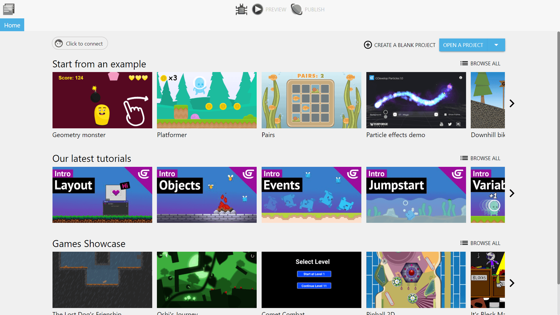 Wait till the process is complete, navigate to where all your new programs are installed, and double click on the GDevelop application to launch the editor. You will be greeted with the welcome screen on the start page. From here you can see game templates, tutorial videos, and other games made with the engine.