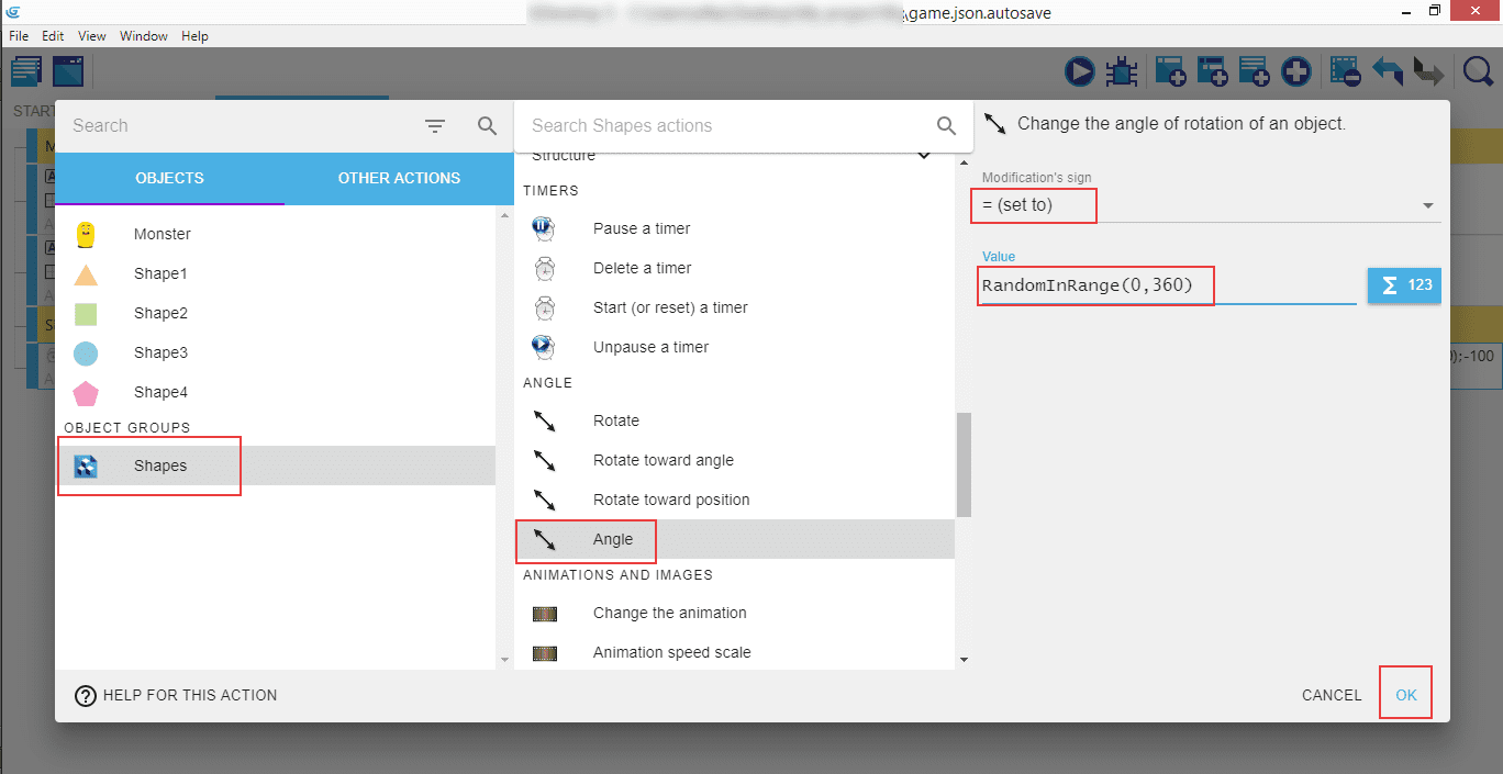 Next create a new event above the shapes event and give it the condition "at beginning of the scene", and copy/paste the earlier create "Start (or reset) a scene timer" action for "ShapeCreation" to this new event. This will start the timer at the beginning of the game in so the shapes event will trigger the first time.
