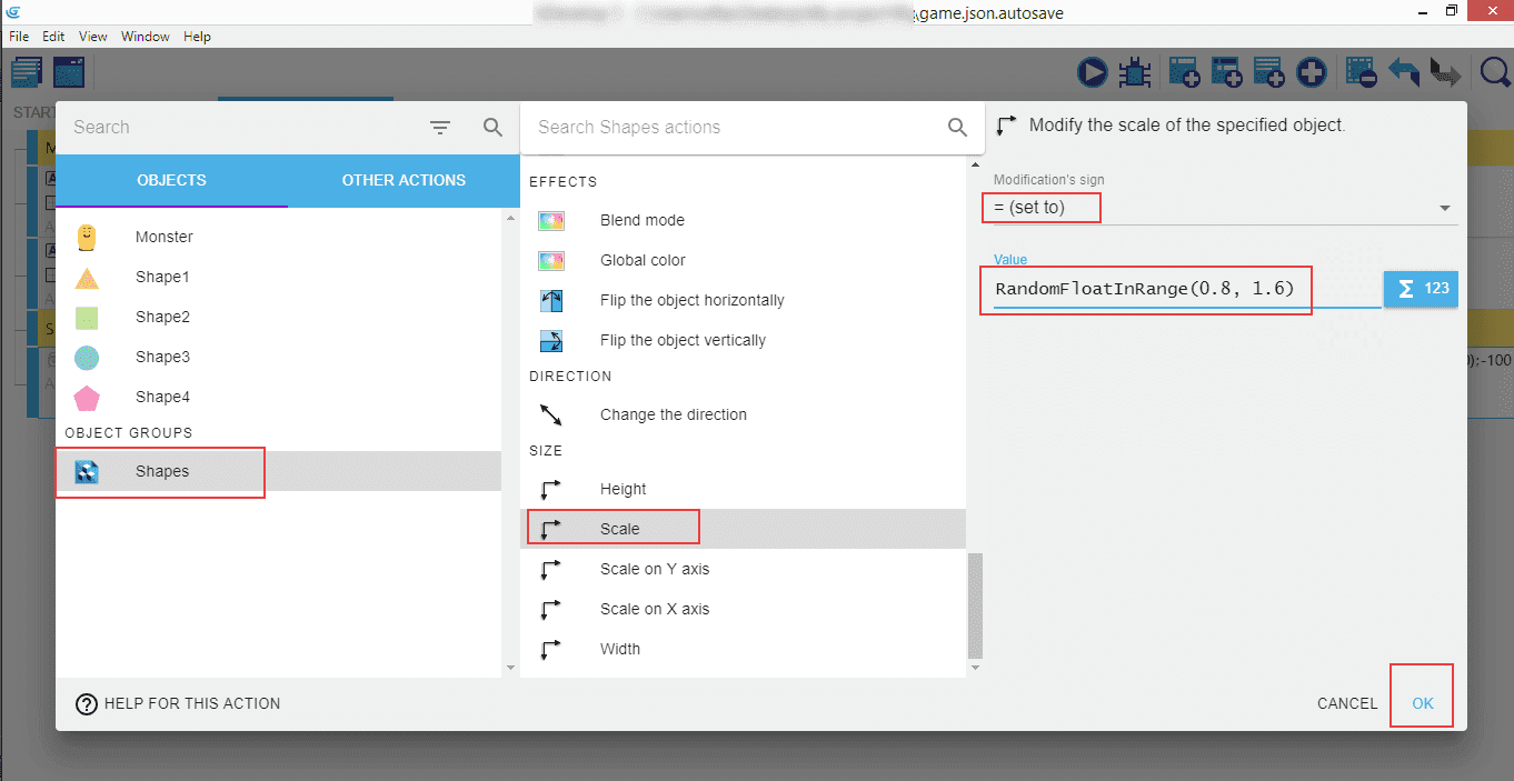 The three values we will enter are: "Text representing the name of the object to create", "X position", and "Y position". Name it "Shape" + ToString(RandomInRange(1,4))