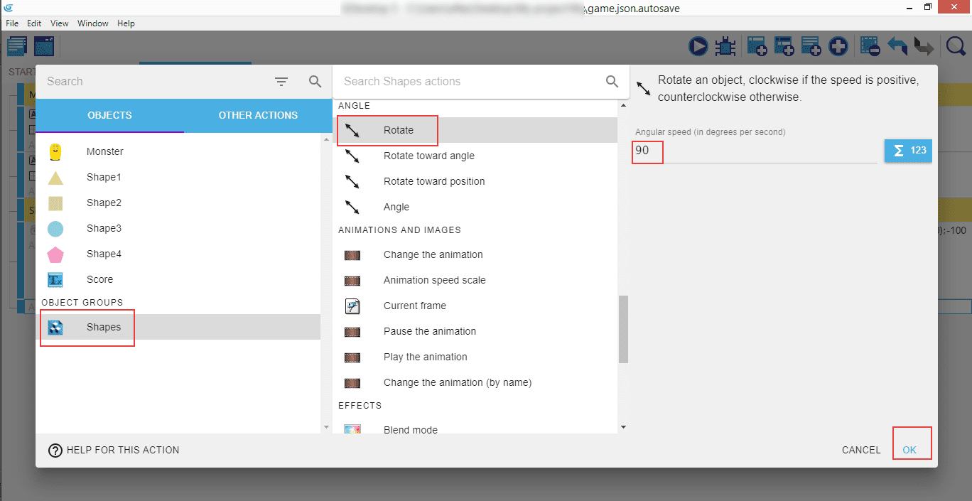 Add another action: "Shapes", then "Rotate", and set the "Angular speed (in degrees per second)" to 90