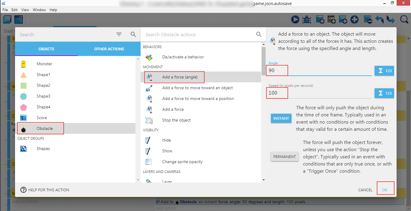 Remember about having the "Obstacle" selected, then look for "Add a force (angle)", enter 90 into the "Angle" field, and 100 into the "Speed".
