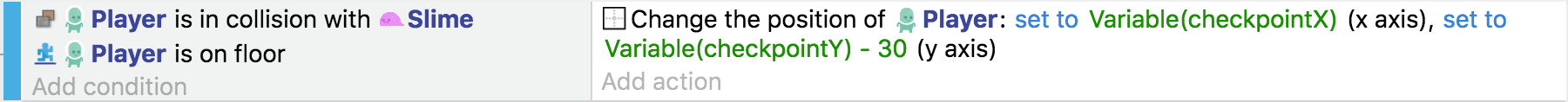 The condition now stores the X and Y position of the "checkpoint" object with which our "Player" object has collided. So, instead of deleting the "Player" sprite object, we set its X and Y positions using the variables.