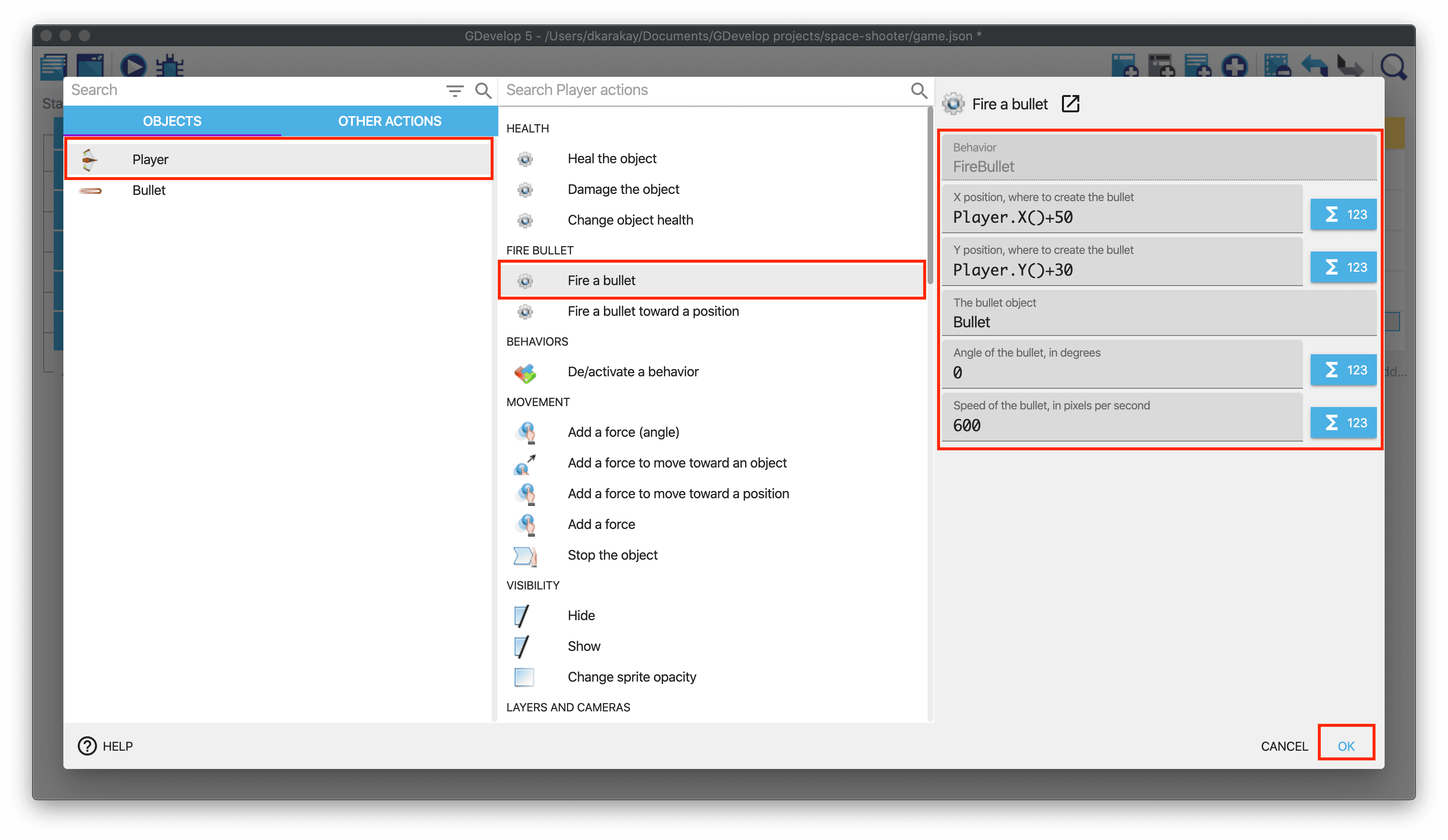 Now, we will add the shooting action. Click on add action in the same event, and select Player. Then, on the top, you can see the new actions coming from our behaviors. Select Fire a bullet and fill out the requirements like below: