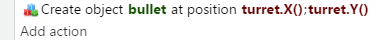 The only thing is left to do is to tell GDevelop to fire the bullets from the "Canon" point of the "turret" object. So in our "create bullet" action, we need to change turret.X() and turret.Y() expressions, to turret.PointX("Canon")