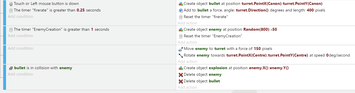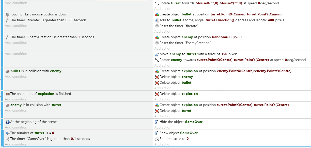 We are now going to create the "Events" used to animate the entire game. In the first event, the "turret" must be rotated toward the player's mouse.