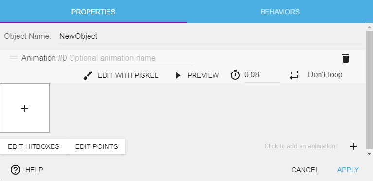 Finally, we want to add an animation to the object. Click/select the "add animation" button in the properties window.