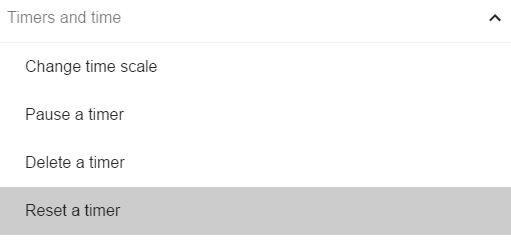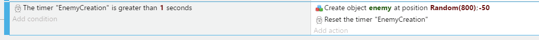 Finally, let's add an action to reset the timer ( "Timers and time", "Start (or reset) a scene timer"). Enter “EnemyCreation” as the name of the timer. Again, don't forget the quotes when you enter the name of the timer.