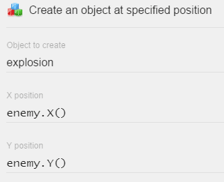 Finally, instead of creating the "explosion" object at the "Origin" point of the "enemy", it is necessary to create the object at the Centre Point. Change the expression in the create explosion action from enemy.X()