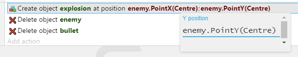 Add an action to create the explosion object in the same way that we created the bullets and the enemies. For X and Y position, use the expression enemy.X() and enemy.Y(). This expression is going to get the X and Y position of the enemy object that is in collision with the bullet.