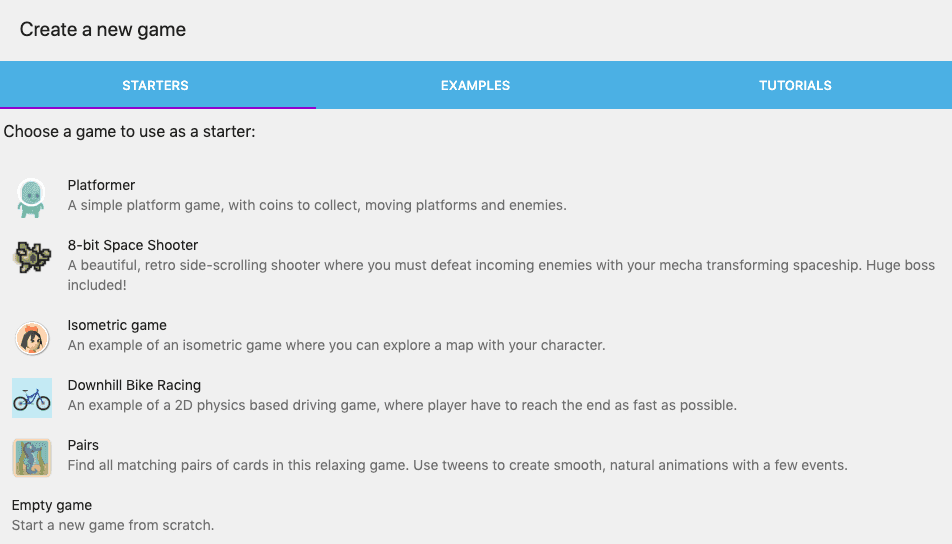 There are also lots of examples and templates bundled with GDevelop! You can find more by visiting: gametemplates.itch.io