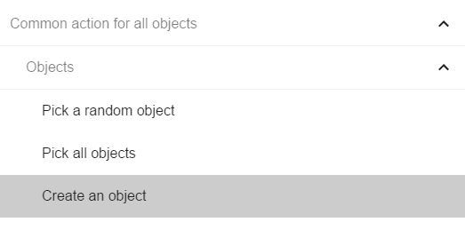 When “Create a new object” is selected, another list of choices will open on the right side of the selector panel. It displays the name of the action as well as the parameters for the action. Fill in the first parameter by selecting/clicking on “Object”.“bullet” will pop up from a list of the available objects. Select “bullet” from the list.