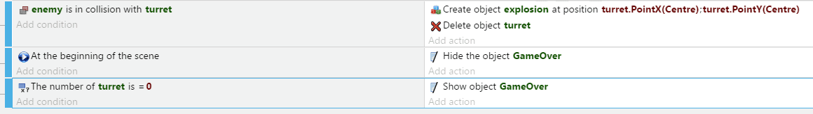 Until now, the player could not die. When an enemy tank is hitting the player's turret, we want the turret to be destroyed. Add a new event. Follow the same procedure that you followed to create an event to destroy the enemies.