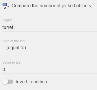 For the first parameter on the right side select the turret object, for the sign of test select the equal sign and for the value of test enter 0 as we want to test if the number of the turret in the scene is 0.