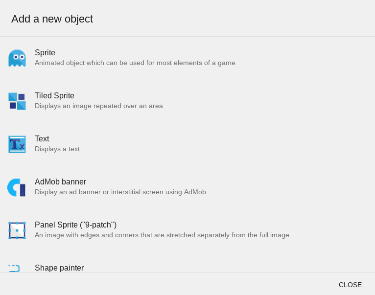First, we must create the objects used for the enemies: Add an object to the object list ( Right-click on an existing object > Add an object. Choose a Sprite object as before. ). Name it "enemy".