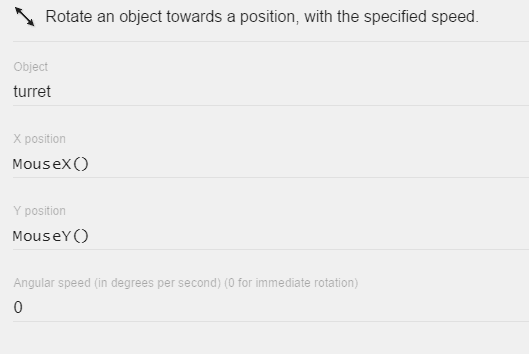When "Rotate toward the position" is selected, another list of choices will open on the right side of the selector panel. It displays the name of the action as well as the parameters for the action. Fill in the first parameter by selecting/clicking on "Object". "turret" will pop up from a list of the available objects. Select "turret" from the list.