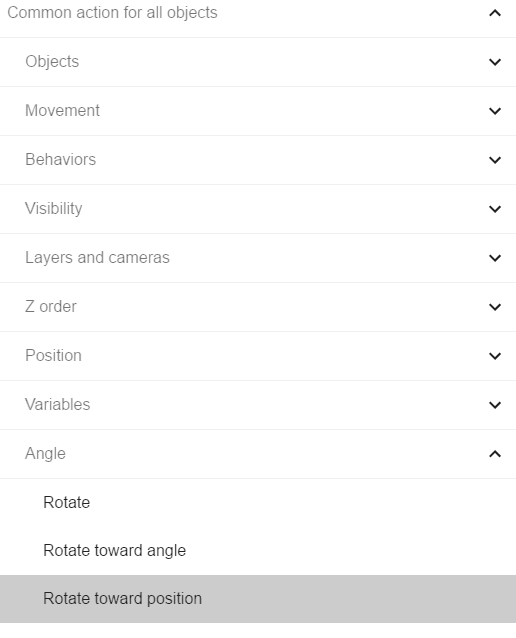 Now, you are going to write your first action. This action will turn the "turret" toward the mouse. After click/selecting the "Add Action", a new list panel will appear. Choose the action "Common action for all objects". A drop-down list of more options will appear. Select/click "Angle". Another drop-down list will be shown. Select/click "Rotate toward the position".