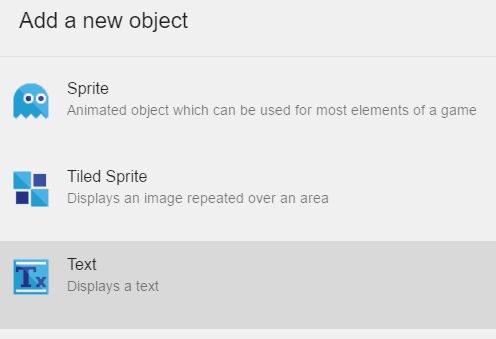 Add a new object using the Scene Objects list. This time, choose a "Text" object. Name it "GameOver".