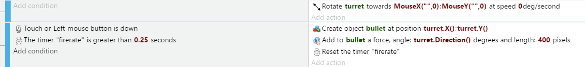 The next event needed will check to see if the left mouse button is clicked/pressed. If it is pressed/clicked, the action will create the bullets that will be fired.