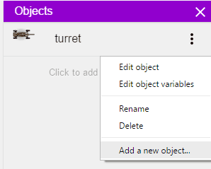 you will need a new "bullet" object. In the Scene "Objects" list located on the right side of the GD interface, mouse click on the "turret" object. Choose "add a new object" or, alternatively, mouse click the "add new object" button.