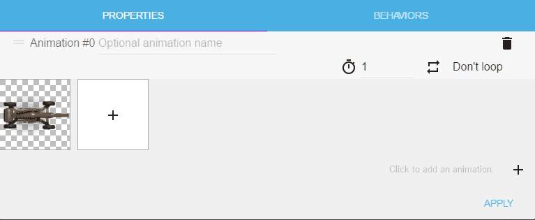 You need to add the turret image as an animation. Click the big plus symbol . Browse to the project folder. Find the image aaguntopdown.png.